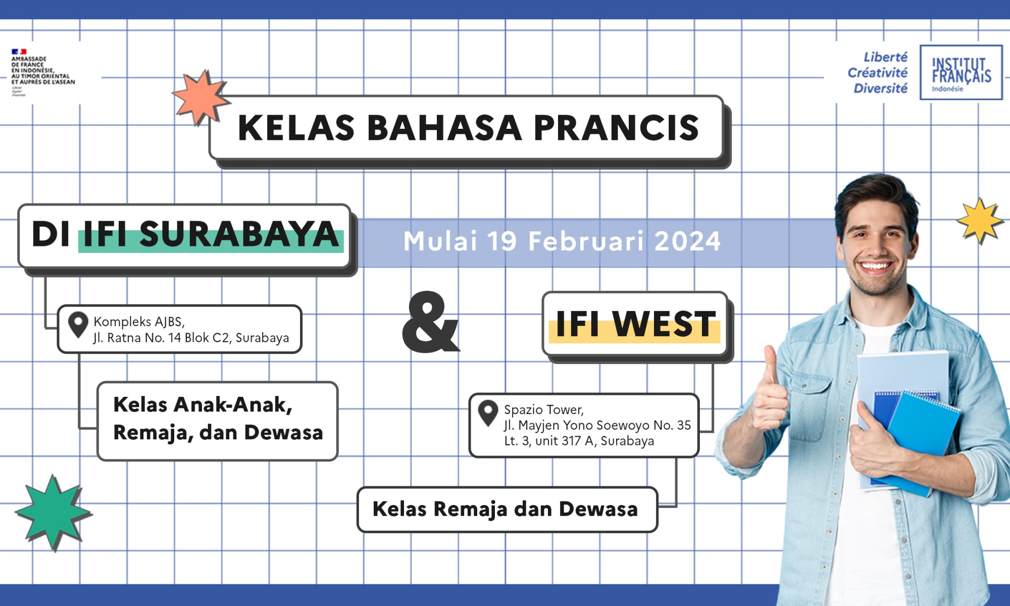 Vous voulez apprendre le français mais vous inquiétez des horaires inadaptables ? L’IFI Surabaya et l’IFI West propose des horaires variées ce début de l’année 2024 pour les enfants, adolescents et adultes.