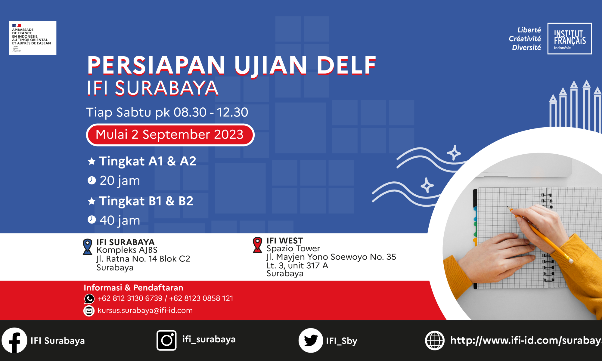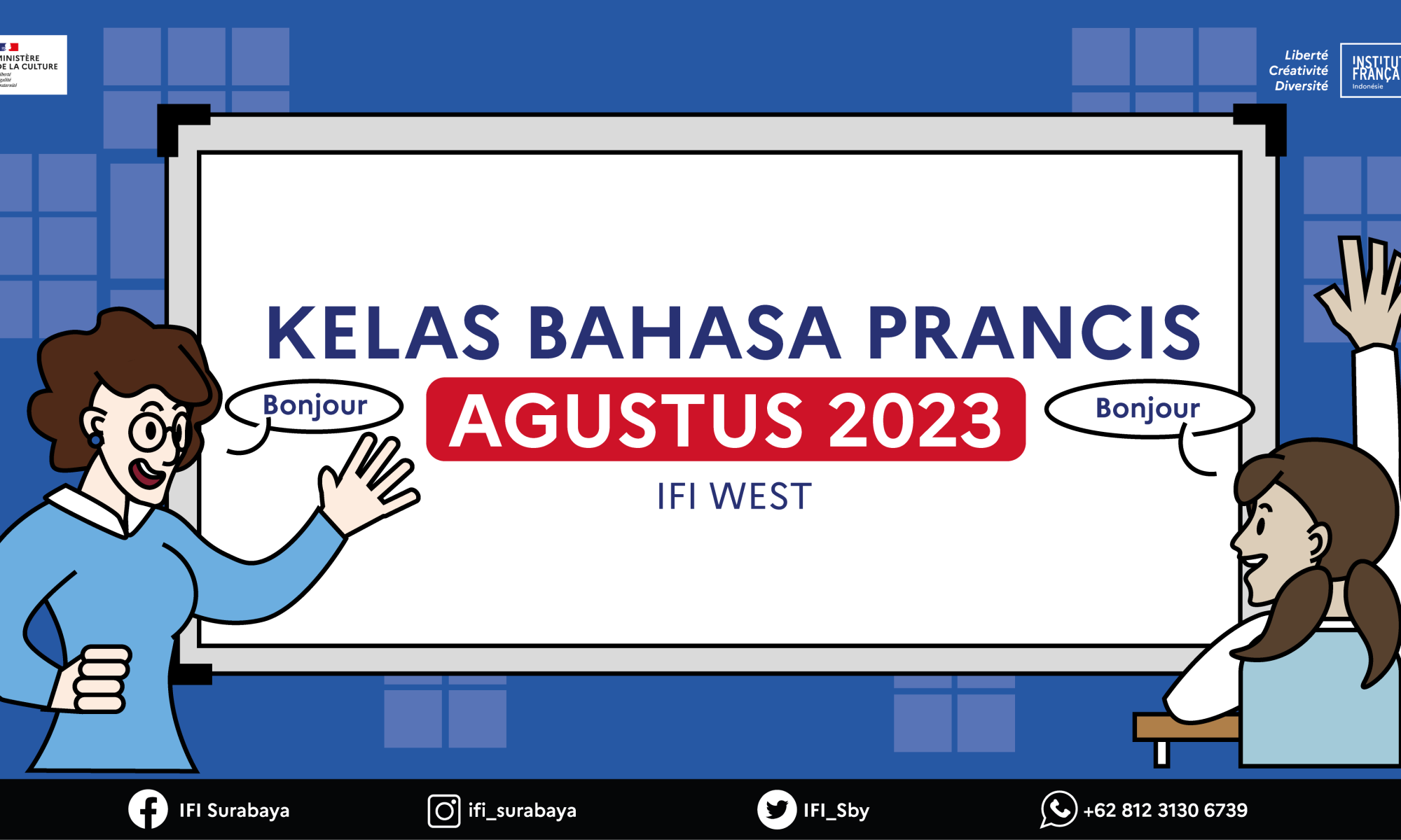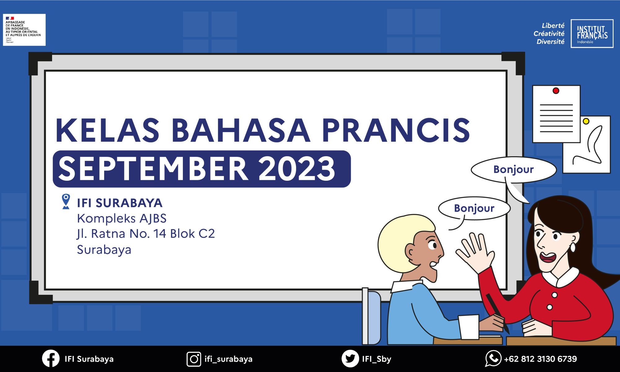 Vous voulez apprendre le français mais vous inquiétez des horaires inadaptables ? L’IFI Surabaya et l’IFI West propose des horaires variées en octobre pour les enfants, adolescents et adultes.
