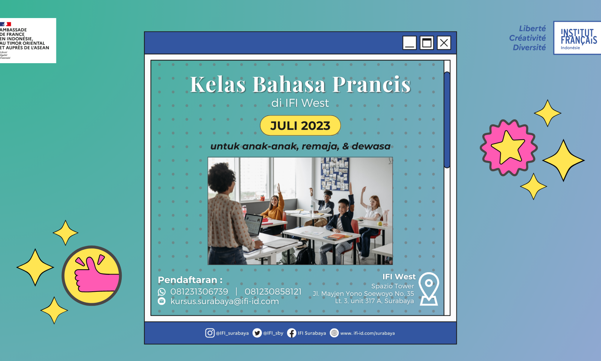 Sous l’autorité de Directeur de l’IFI Surabaya et en coordination avec la responsable pédagogique auprès de laquelle il/elle est placé(e), il/elle l’enseignant dispense des cours de français langue étrangère (FLE), en ligne et en présentiel, pour tout le type de publics et tout le niveau à l’IFI Surabaya, à l’IFI West et aux établissements partenaires. Il/elle participe à toutes les activités de l’IFI Surabaya et de l’IFI West, aux sessions d’examens du DELF et du DALF et contribue aux axes de développement des services éducatifs proposés par l’IFI Surabaya, en collaboration avec la responsable pédagogique.