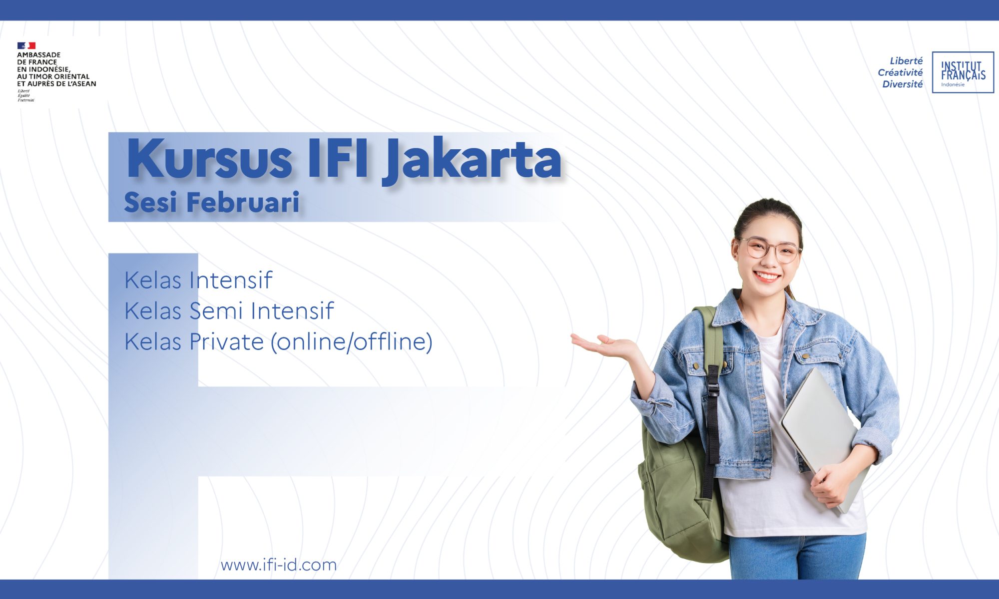 IFI Jakarta menawarkan program kursus bahasa Prancis yang dirancang untuk semua tingkatan, dari pemula hingga mahir. Dengan pengajar yang berpengalaman, kalian akan mendapatkan pembelajaran yang mendalam dan interaktif. Kursus ini adalah kesempatan emas untuk memperdalam pengetahuan bahasa dan budaya Prancis yang akan sangat bermanfaat bagi karir dan kehidupan sosialmu.