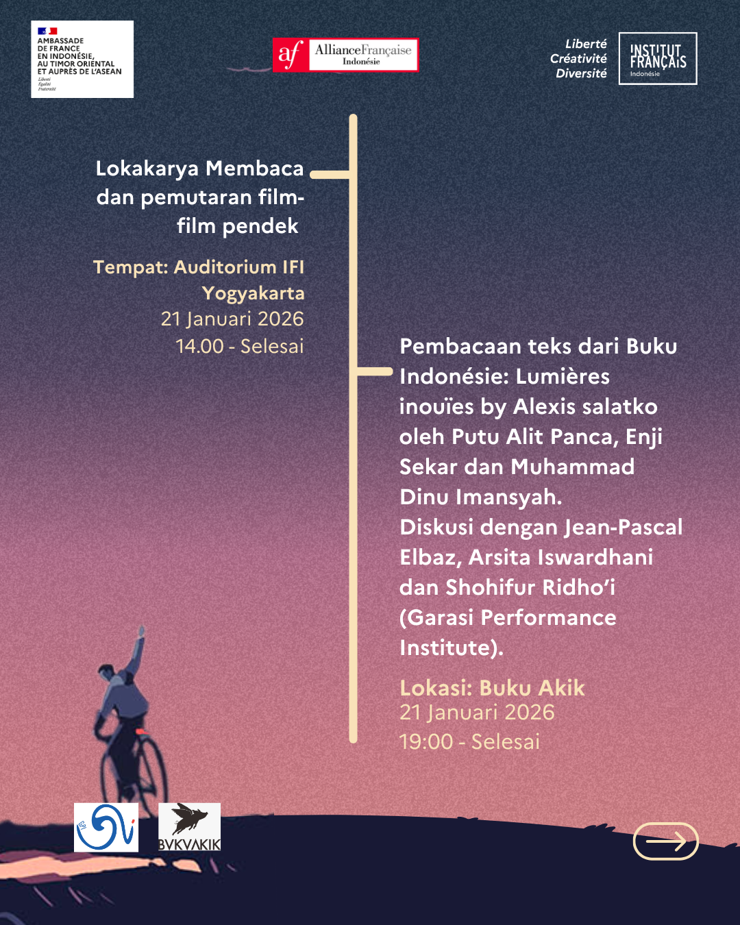 Institut français d’Indonésie (IFI) menyelenggarakan edisi ke-10 Les Nuits de la lecture 2026 di seluruh jaringannya di Indonesia, dengan menawarkan program yang disesuaikan di setiap kota dengan tema yang diangkat dan menampilkan kekayaan sastra Prancis dan Indonesia.