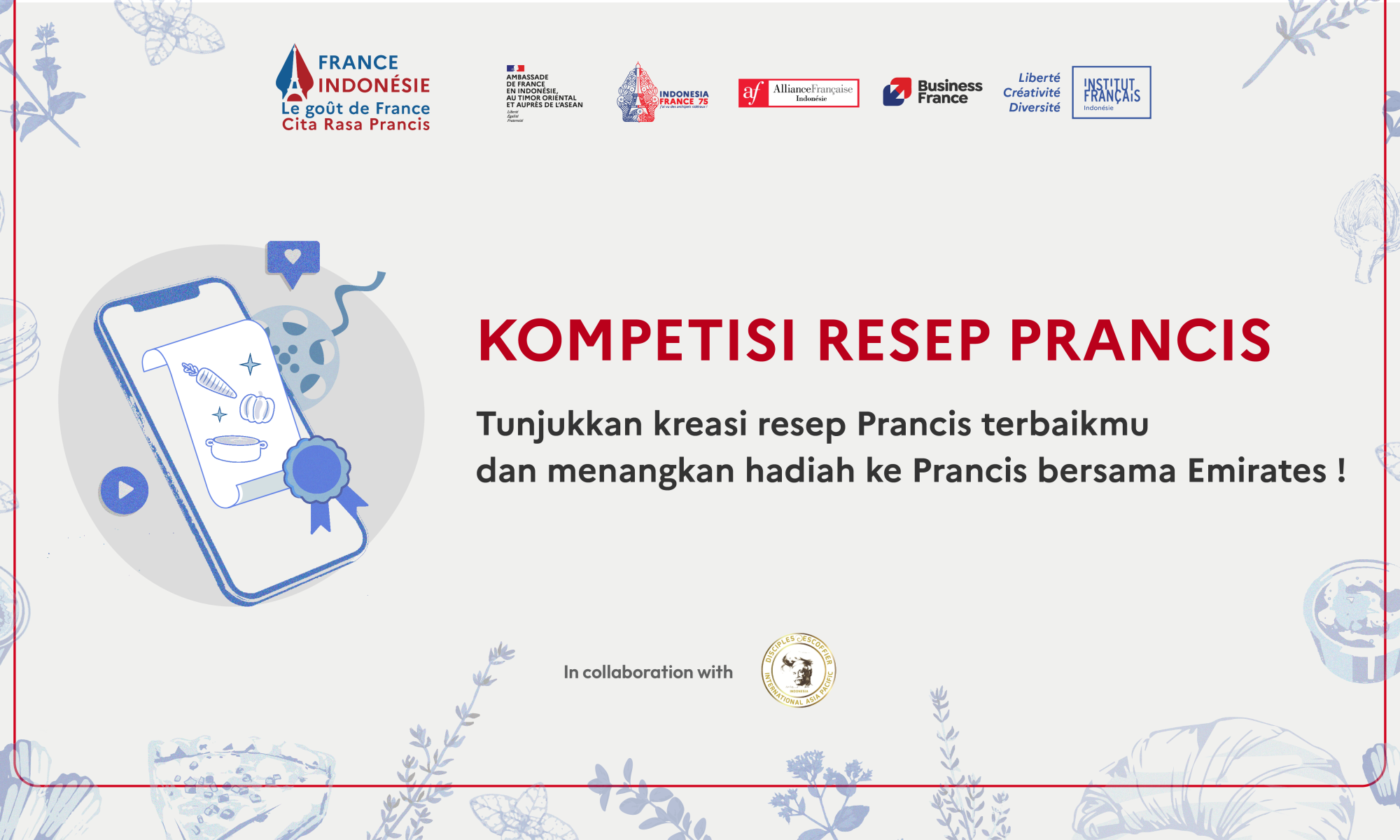 La semaine de la gastronomie Le goût de France – Cita Rasa Prancis est de retour cette année ! Comme l’édition précédente, l’IFI organise à nouveau un concours de recettes françaises. La meilleure recette, selon le jury, aura la chance de gagner un voyage en France, y compris le billet aller-retour Jakarta-Paris offert par Emirates ainsi que le visa et l’argent de poche ! Montrez-nous vos meilleures créations de recettes françaises en suivant les conditions ci-dessous :