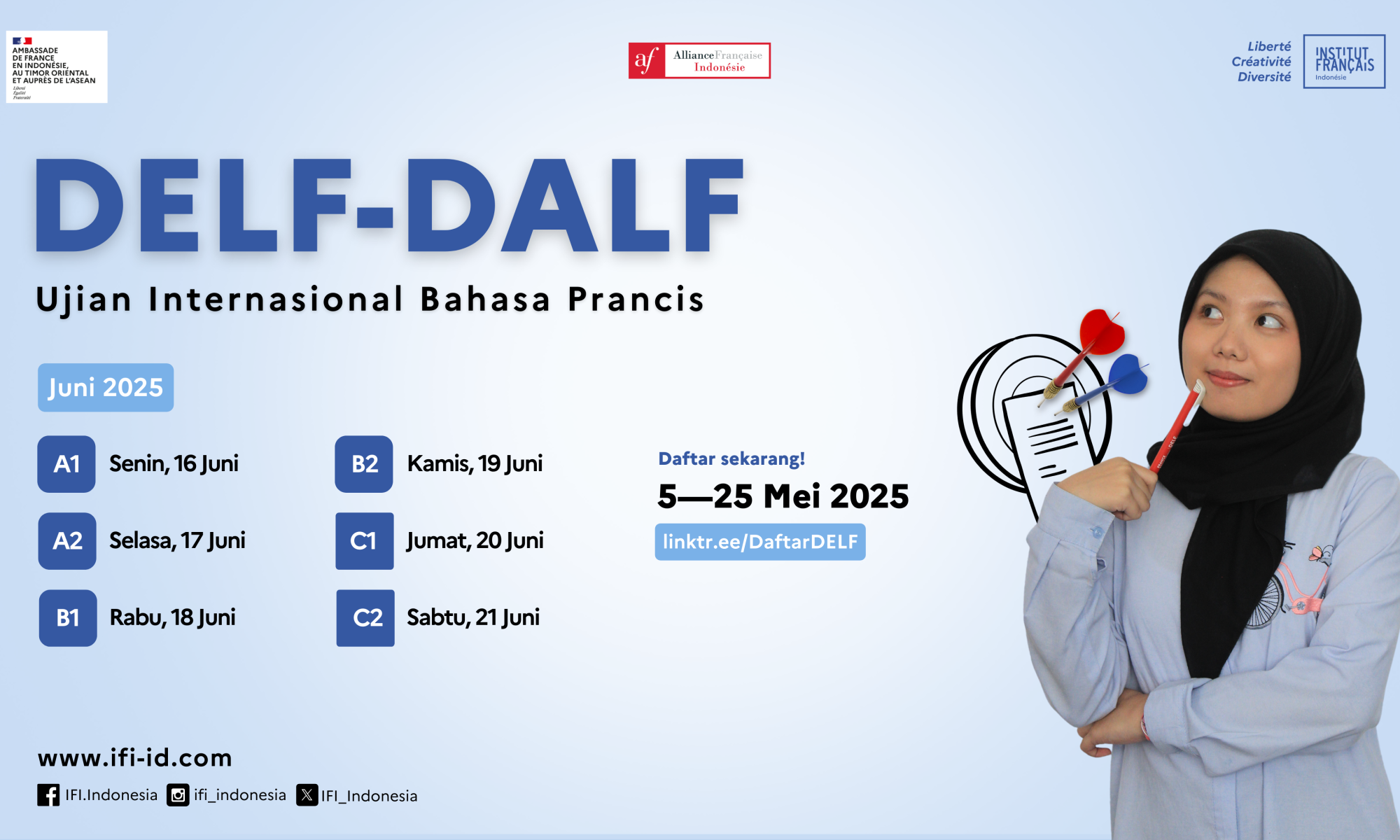 Les examens DELF-DALF se dérouleront trois fois en 2024 : mars, juin et novembre. Ils sont organisés dans les institutions autorisées : l’Institut français d’Indonésie (IFI), l’Alliance Française (AF), ainsi que les établissements partenaires de l’IFI/AF.