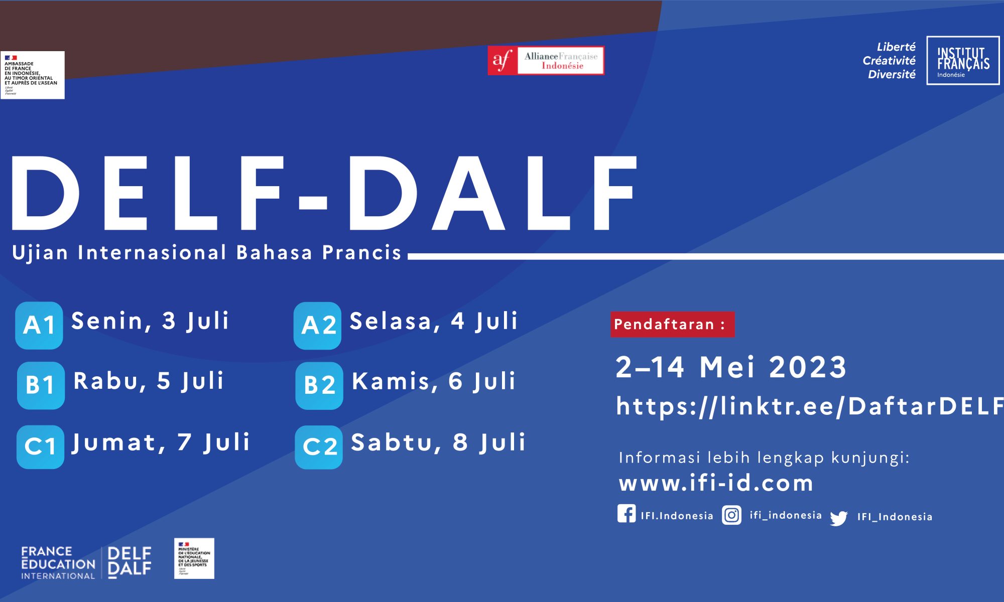 Les résultats de la session de mars 2024 de l’examen international DELF-DALF de l’Institut français d’Indonésie (IFI) et de l’Alliance française (AF) ont été officiellement annoncés. Nous félicitons tous les candidats qui ont passé l’examen avec succès lors de cette session ! Pour récupérer votre attestation de réussite ou pour obtenir d’autre information supplémentaire, veuillez vous rendre au secrétariat de cours du centre d’examen.