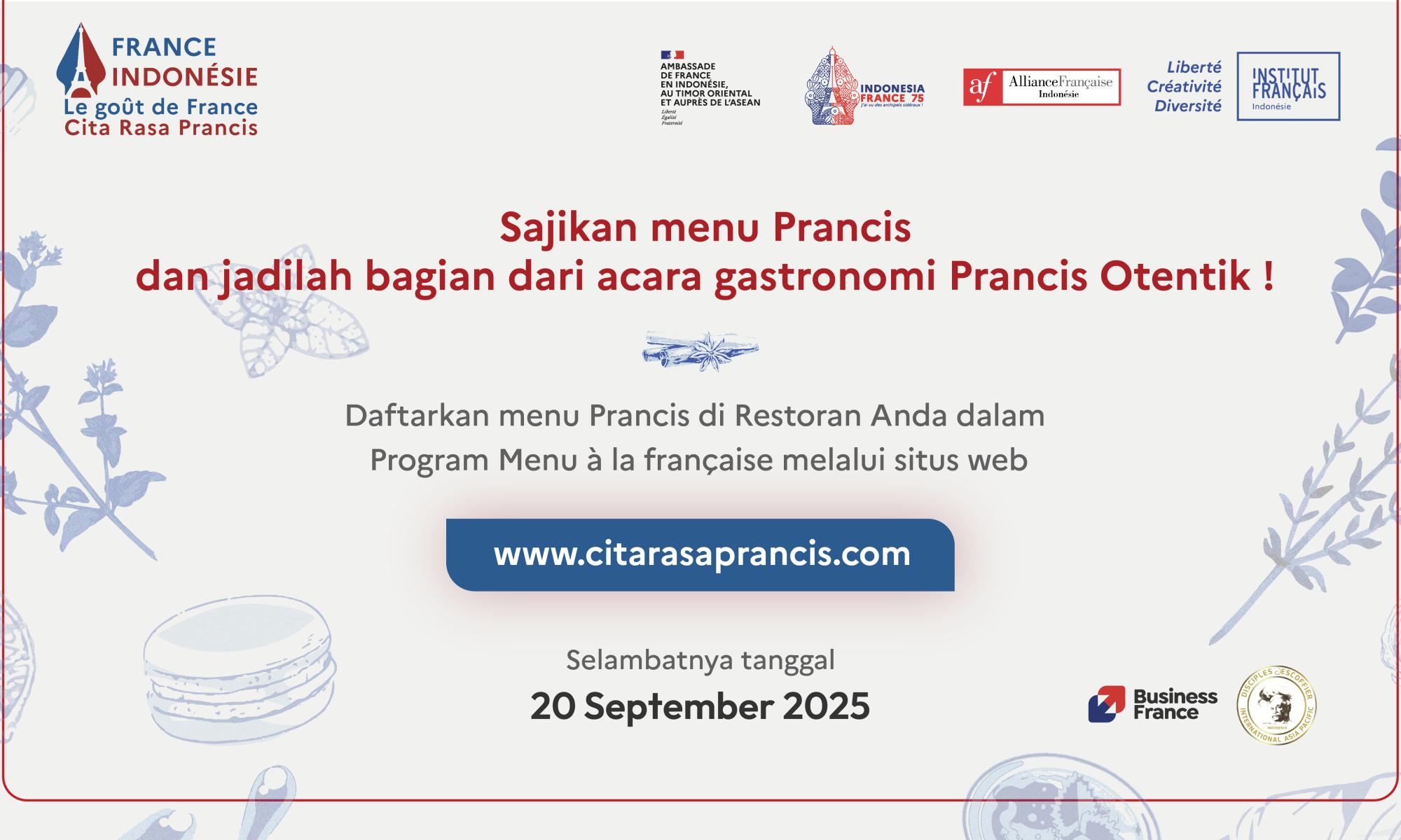 Ce formulaire est destiné aux restaurants, hôtels, cafés, boulangeries, bars, etc. proposant un ou plusieurs menus français ou souhaitant proposer un menu français spécifique, afin de participer au programme Menu à la française pendant l’événement Le Goût de France – Cita Rasa Prancis 2025, qui se tiendra du 1er au 11 octobre 2025.